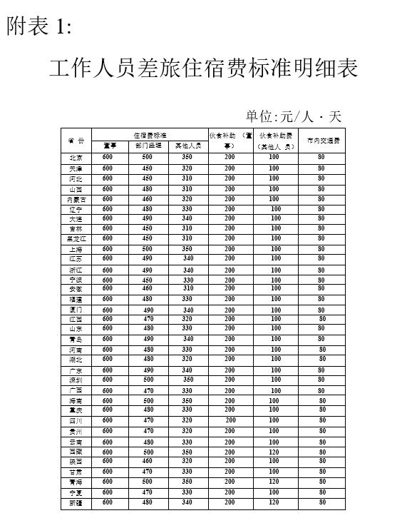 工作人员公务省外出差住宿费标准详见《工作人员差旅费住宿标准明细表》(见附表一)。