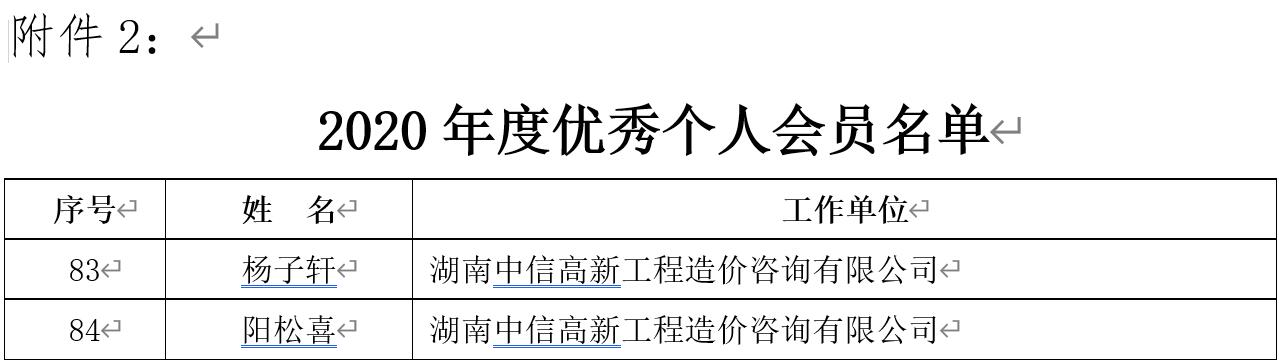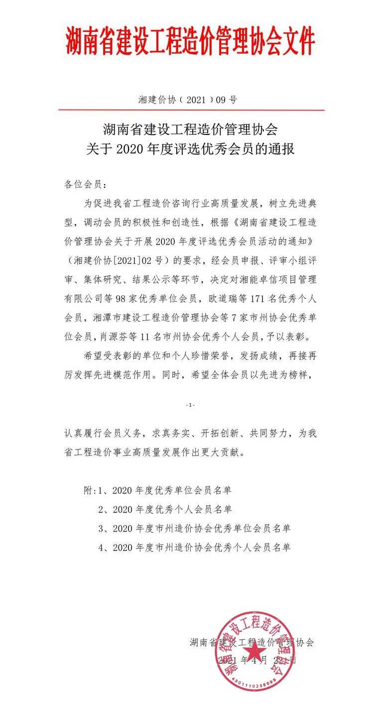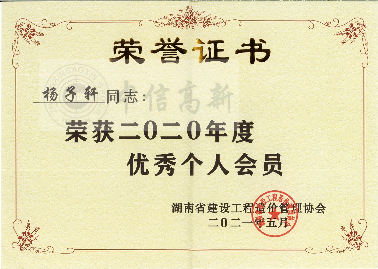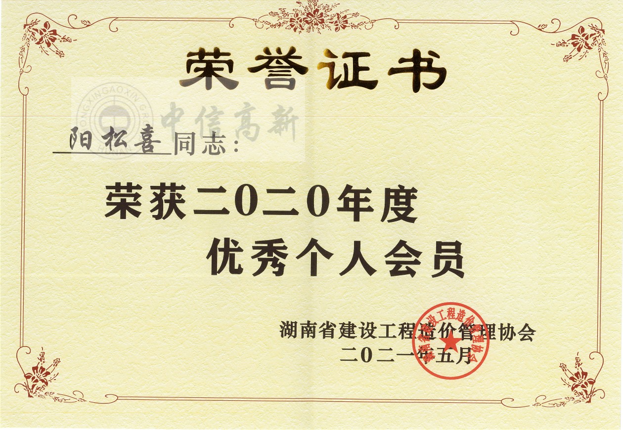 热烈祝贺湖南省建设工程造价管理协会组织的2020年度评选优秀会员活动中,公司杨子轩、阳松喜荣获“优秀个人会员”荣誉称号。