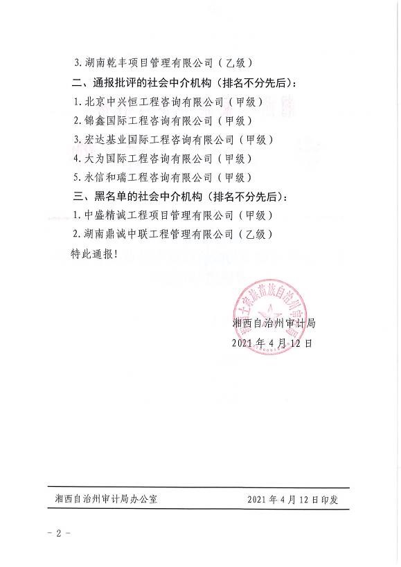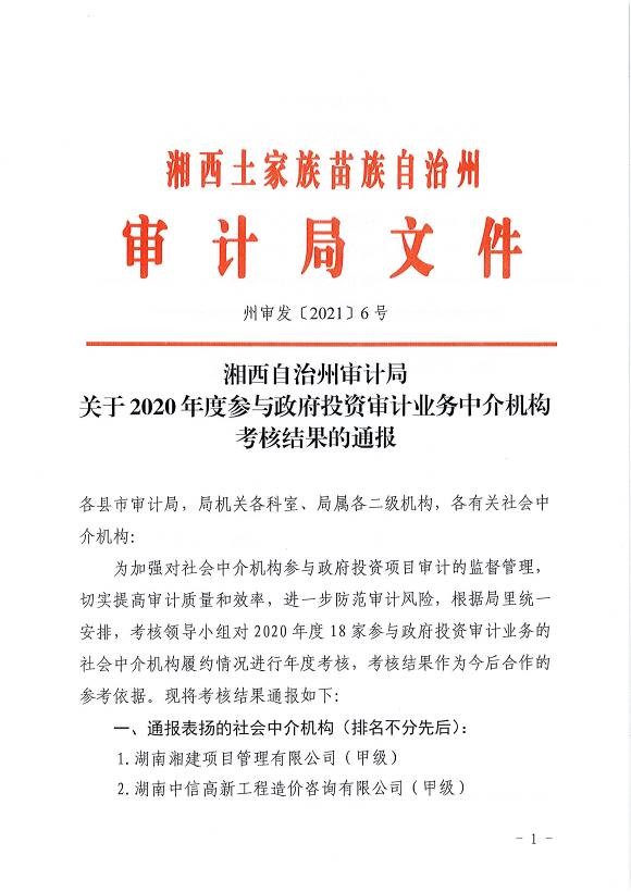 热烈祝贺湖南中信高新工程造价咨询有限公司获得湘西自治州审计局2020年度中介机构考核评价-优秀。